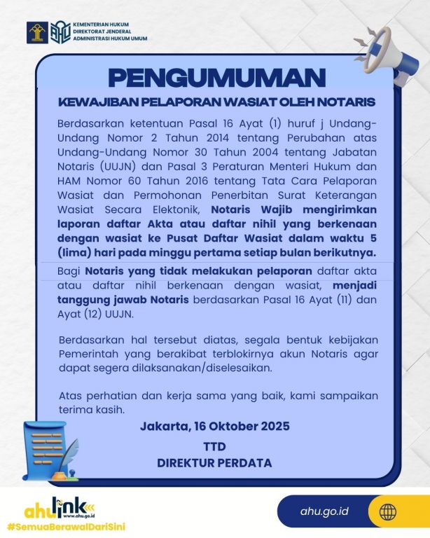 PENGUMUMAN KEWAJIBAN PELAPORAN WASIAT OLEH NOTARIS