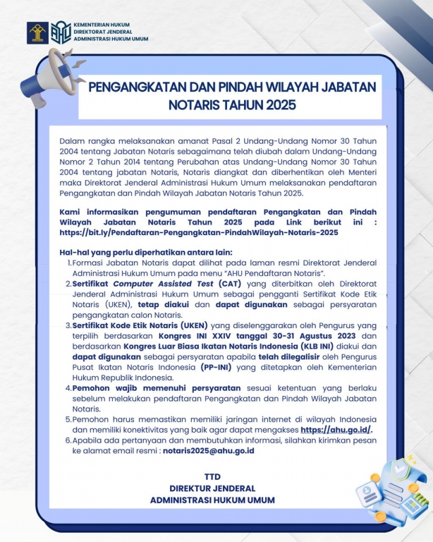 PEMBERITAHUAN PENGANGKATAN DAN PINDAH WILAYAH JABATAN NOTARIS 2025