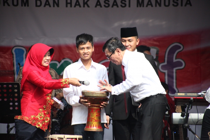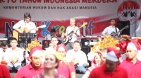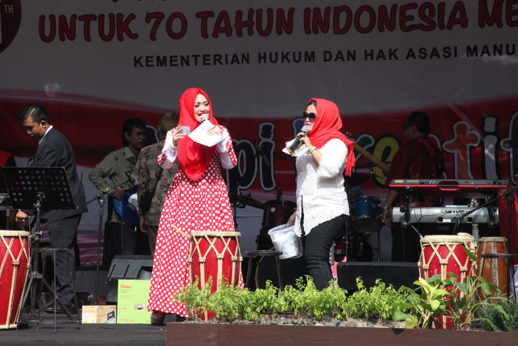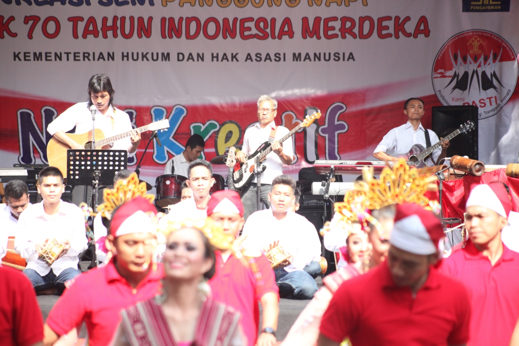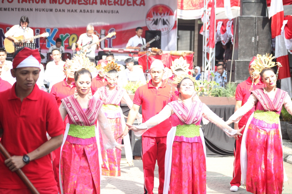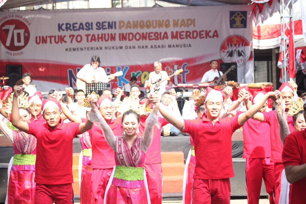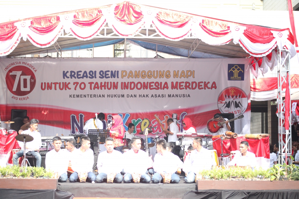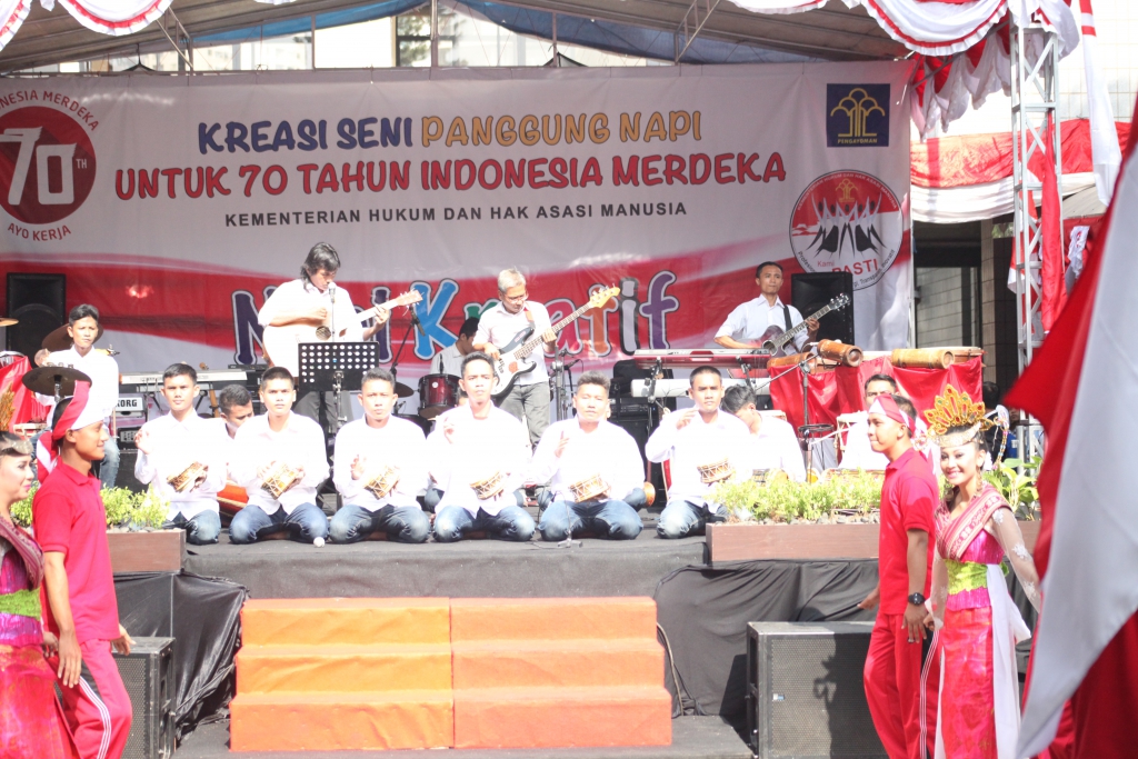 Jakarta, 17 Agustus 2015 – Dalam rangka memeriahkan peringatan HUT ke 70 Tahun Kemerdekaan Republik Indonesia, Kementerian Hukum dan HAM menampilkan “Kreasi Seni Panggung Napi Untuk 70 Tahun Indonesia Merdeka” acara yang dibuka oleh Menteri Hukum dan HAM Yassona H. Laoly dengan pemukulan tifa. Kegiatan tersebut diisi oleh warga binaan dari Jawa Barat, Banten dan DKI Jakarta. Acara tersebut menampilkan kreatifitas warga binaan dalam gerak tari, puisi dan menyanyi, serta diselingi pembagian hadian pertandingan 17 Agustus yang dilaksanakan pada tanggal 14 Agustus 2015 dan pembagian door price. (noe)