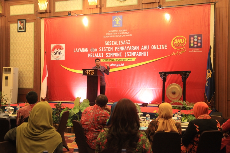 Semarang, 8 Oktober 2015 – Dalam rangka mensosialisasikan Layanan dan Sistem Pembayaran AHU Online Melalui Simponi – SIMPADHU kepada para Notaris, Calon Notaris dan Mahasiswa Kenotariatan di wilayah Jawa Tengah, yang bertempat di Hotel Santika Premiere Semarang. Kegiatan ini dilaksanakan untuk menyampaikan informasi tentang sistem pelayanan Direktorat Jenderal Administrasi Hukum Umum Online dengan Sistem Pembayaran PNBP Administrasi Hukum Umum Online (SIMPADHU) yang telah terintegrasi dengan SIMPONI Kementerian Keuangan.