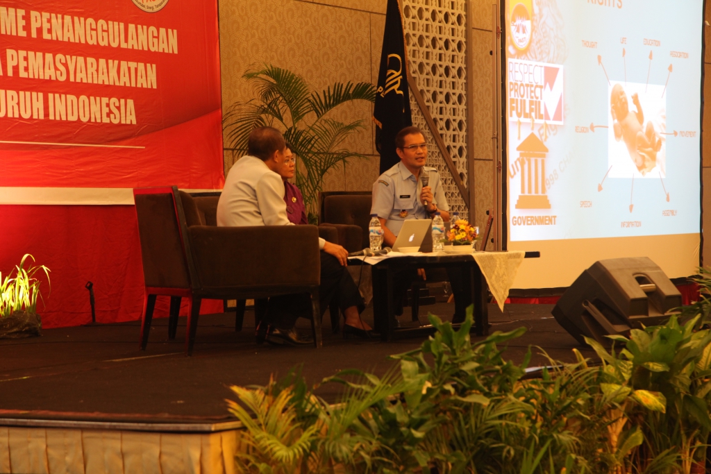 Kepala Badan Penelitian dan Pengembangan HAM Y. Ambeg Paramarta menjelaskan tentang Pembinaan Narapidana Dalam Prespektif Haka Asasi Manusia yaitu Hak Asasi Manusia merupakan hak dasar yang secara kodrati melekat pada diri manusia, bersifat universal dan langgeng oleh karena itu harus dilindungi, dihormati, dipertahankan dan tidak boleh diabaikan, dikurangi atau dirampas oleh siapapun. Sedangkan tujuan pidana penjara pemasyarakatan bukan hanya menimbulkan derita bagi narapidana, pidana bukanlah tindakan balas dendam dari negara tetapi cara untuk memberikan bimbingan. Serta Reintegrasi sosial adalah pemulihan kesatuan hubungan hidup, kehidupan dan penghidupan narapidana sebagai mahluk sosail. Dalam reintegrasi sosial terkandung makna hak narapidana dan kewajiban negara untuk menghormati, melindungi dan memenuhi HAM.
