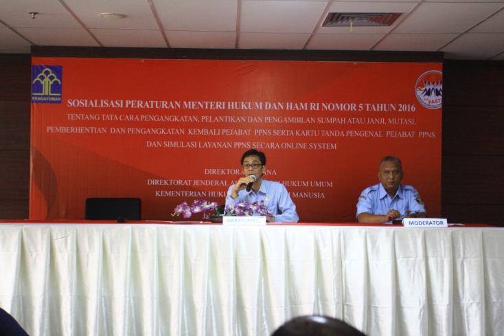 Acara sosialisasi sistem aplikasi permohonan dan penyelesaian PPNS secara online dibuka oleh Sekretaris Ditjen AHU Dr. Freddy Harris, yang dihadiri oleh Direktur Pidana Salahudin, SH, Kasubdit PPNS Mohamad Fajar, SH.,MH, Kasi bimbingan dan evaluasi PPNS Ibu Etty Nuryani Mantin, SH.,MH, para pejabat eselon III dan eselon IV dilingkungan Ditjen AHU serta para undangan PPNS dari instansi lain. Menurut Dr. Freddy Harris sistem online PPNS dapat dikelola dengan baik dan propersional. Dengan adanya Peraturan Menteri No. 5 tahun 2016, “bahwa dalam 2 tahun sekali PPNS dimutasi untuk pengurusannya tidak memakan waktu banyak dan tidak harus bolak- balik” ungkap Freddy Harris.