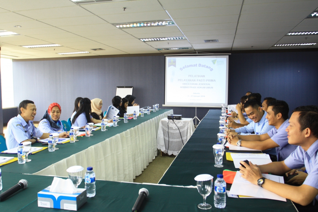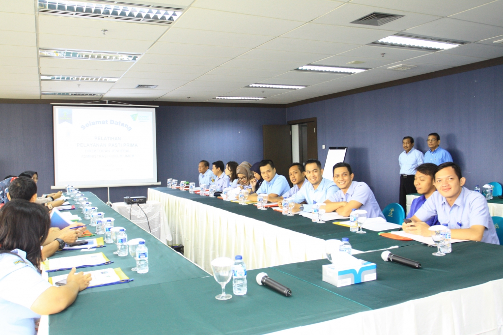 Acara Pelatihan Pelayanan Pasti Prima, Ditjen AHU bekerjasama dengan Dompet Dhuafa Social Enterprise. Peserta terdiri dari pegawai dan tenaga outsorching Ditjen AHU. Pelatihan didampingi oleh para mentor Ary dan Aro, materi meliputi pelatihan komunikasi efektif, praktek komunikasi yang berprofesional, etika dalam bekerja, serta customer service .