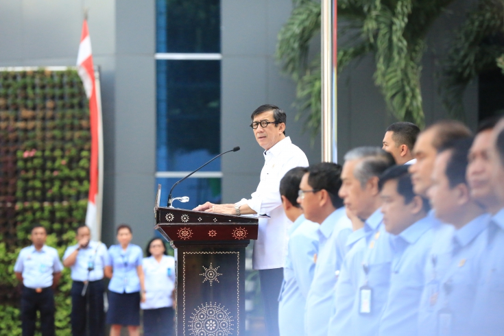 Jakarta - Tahun 2016 menjadi tahun yang berat bagi Kementerian Hukum dan HAM. Peredaran narkoba di sejumlah Lapas dan Rutan di Indonesia kian merajalela. Menteri Hukum dan HAM Yasonna H Laoly mengatakan, akan segera mengambil langkah-langkah penyelesaian terkait peredaran narkoba. Dalam Apel Akbar, Senin (4/4) Yasonna sebagai inspektur upacara menyampaikan, Kejadian yang terjadi di Bengkulu dan tempat-tempat lain merupakan kejadian yang sangat disesalkan dan akan terus dicari solusi terbaik agar kejadian tersebut tidak terulang kembali.
