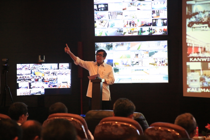 Jakarta – Menteri Hukum dan Hak Asasi Manusia Republik Indonesia, Yasonna H Laoly melakukan teleconference dengan 33 Kantor Wilayah Kementerian Hukum dan Hak Asasi Manusia Kamis (14/04) di Gedung Sentra Mulia. Yasonna, mengancam akan mencopot jajarannya seperti Kepala Lembaga Pemasyarakatan (lapas), Kepala Divisi Pemasyarakatan, bahkan Kepala Kantor Wilayah Kemenkumham jika menghambat pemberantasan narkoba seluruh Indonesia.