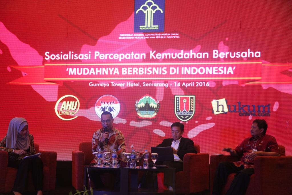 Semarang-Direktorat Jenderal Administrasi Hukum Umum kembali mengadakan Sosialisasi Layanam AHU online dalam semarak acara Kemudahan Berbisnis di Indonesia yang digelar di Semarang. Sosialisasi ini melibatkan lembaga pembiayaan, Notaris, UMKM, Dinas Perindustrian dan Perdagangan, Badan Penanaman Modal Daerah Jawa Tengah, para pebisnis pemula, kerajinan kecil dan menengah yang terselenggara berkat kerjasama Ditjen AHU dengan Pemerintah Provinsi Jawa Tengah dan Pemkot Jawa Tengah Semarang.