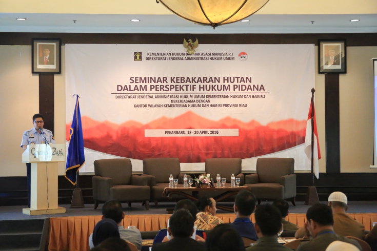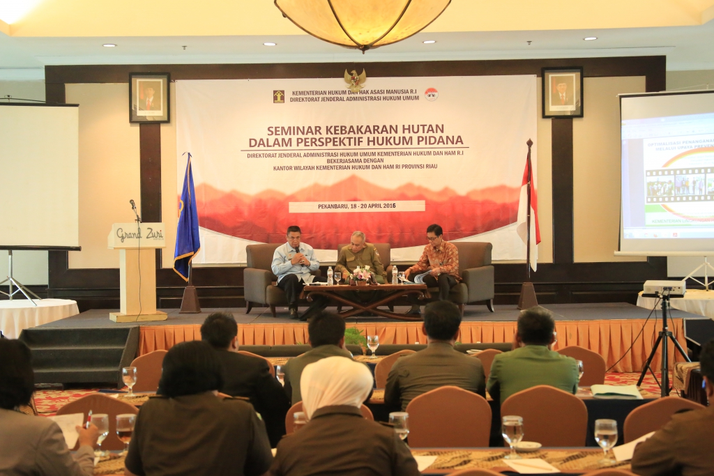 Oleh sebab itu, Direktorat Pidana Ditjen AHU yang bekerjasama dengan Kantor Wilayah Kemenkumham provinsi Riau mengadakan Seminar sehari yang bertajuk “Seminar Kebakaran Hutan dalam Perspektif Hukum Pidana” di hotel Grand Zuri, Pekanbaru (19/4/2016).