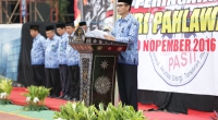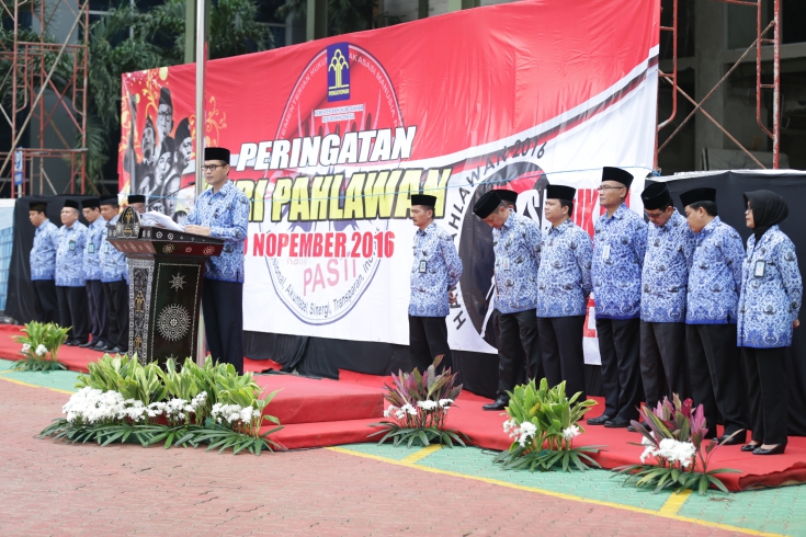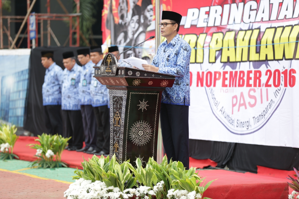 Bertindak sebagai inspektur pada upacara ini adalah Kepala Badan penelitian dan pengembangan Hukum dan Ham (Balitbangham) Y.Ambeg Paramarta.Dalam amanat Menteri Hukum dan Hak Asasi Manusia (Menkumham) Yassona H Laoly yang dibacakan oleh inspektur upacara, bahwa Peringatan hari Pahlawan harus mampu menggali upaya , bukan abunya. Dengan meminjam ungkapan Bung Karno, semangat kepahlawanan itu adalah semangat rela berjuang, berjuang mati-matian dengan penuh idealisme dengan mengutamakan kepentingan umum di atas kepentingan pribadi. Semangat kepahlawanan adalah semangat persatuan, persatuan yang bulat-mutlak dengan tiada mengecualikan sesuatu golongan dan lapisan. Semangat kepahlawanan adalah semangat membentuk dan membangun negara. Sehingga Setelah Indonesia merebut kemerdekaanya, semangat kepahlawanan tidak cukup hanya dengan mempertahankan patriotisme defensif, kita butuh patriotisme yang lebih positif dan progresif. Patriotisme sejati bukan sekadar mempertahankan melainkan juga memperbaiki keadaan negeri. Untuk keluar dari berbagai persoalan bangsa hari ini, patriotisme progresif dituntut menghadirkan kemandirian bangsa tanpa terperosok pada sikap anti-asing.