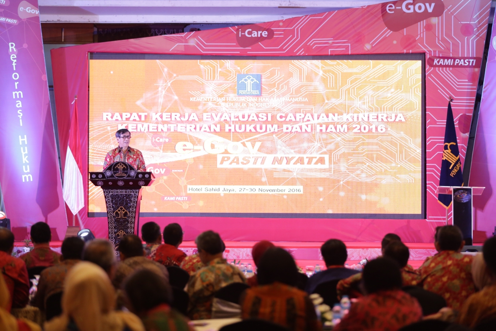 Jakarta – Kementerian Hukum dan Hak Asasi Manusia (kemenkumham) mengadakan Rapat Koordinasi Capaian Kinerja Pelayanan Publik Kemenkumham tahun 2016 dengan tema “E-Gov Pasti Nyata”. Kegiatan ini dilaksanakan sebagai bentuk komitmen jajaran Kemenkumham untuk mensukseskan dan mewujudkan E-Gov Pasti Nyata yang sesuai dengan bentuk implementasi atas Instruksi Presiden agar Kementerian Hukum dan HAM melakukan reformasi hukum dan melaksanakan e-gov disemua bidang tugas dan fungsinya. Acara yang diadakan selama 4 hari di Hotel Grand Sahid Jaya dihadiri 323 orang terdiri dari seluruh pimpinan tinggi madya, staf khusus dan pimpinan tinggi pratama dilingkungan Kemenkumham. (29/11)