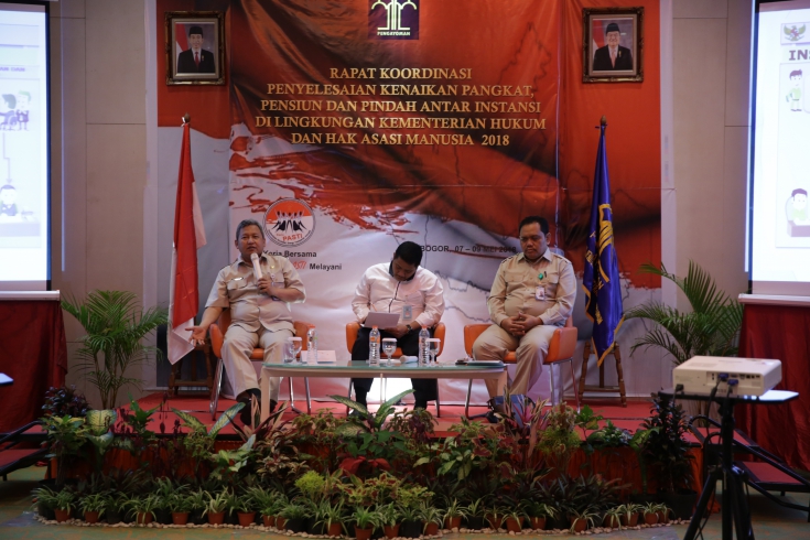BOGOR - Direktorat Jenderal Administrasi Hukum Umum (Ditjen AHU) melalui Bagian Kepegawaian bekerjasama dengan Biro Kepegawaian Sekretariat Jenderal Badan Kepegawaian Negara (BKN), dan Kementerian Sekretariat Negara (Setneg) mengadakan Rapat Koordinasi Penyelesaian Kenaikan Pangkat, Pensiun dan Pindah Antar Instansi Dilingkungan Kementerian Hukum dan Hak Asasi Manusia (Kemenkumham).