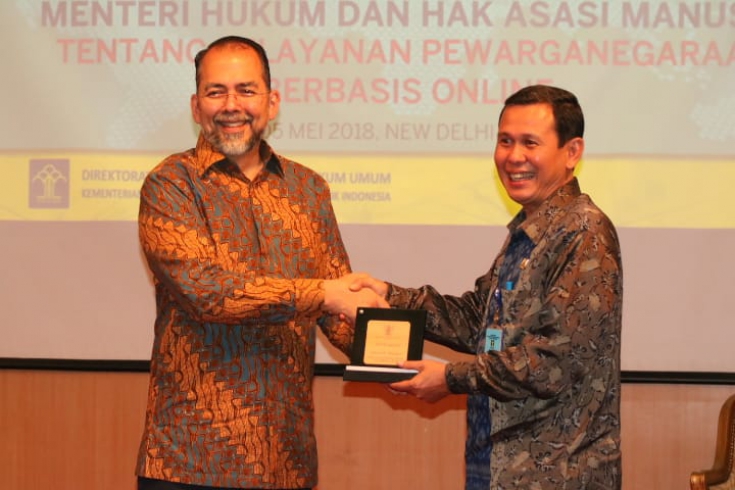 New Delhi - Delegasi Direktorat Jenderal Administrasi Hukum Umum (AHU) dan Imigrasi, Kemenkumham RI dipimpin Direktur Tata Negara, Kartiko Nurintias, menyelenggarakan “Implementasi Peraturan Menteri Hukum dan Hak Asasi Manusia tentang Pelayanan Pewarganegaraan Indonesia Berbasis Online” untuk WNI yang berdomisili di New Delhi dan sekitarnya. Bertempat ‘’ Kegiatan ini merupakan upaya pemerintah dalam menjawab persoalan kewarganegaraan, sekaligus meningkatkan pemahaman WNI yang melakukan kawin campur dengan warga negara asing terhadap tahapan pengajuan untuk memperoleh maupun pelepasan status kewarganegaraan Indonesia serta status kewarganegaraan bagi anak berkewarganegaraan ganda terbatas. Semangat ini sejalan dengan nawacita Presiden RI, bahwa “Negara hadir untuk rakyat dimanapun berada". Kata Direktur Tata Negara, Kartiko Nurintias, di KBRI New Delhi, Sabtu (5/5/18).