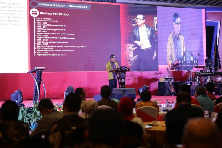 JAKARTA - Menteri Hukum dan Hak Asasi Manusia (menkumham) Yasonna H Laoly buka dalam Rapat kerja dan evaluasi Kementerian Hukum dan Hak Asasi Manusia tahun 2018, tanpak hadir dalam pembukaan acara itu Menteri Agama RI Lukman Hakim Saifuddin, Ketua Ombusmen RI. Prof. Amzulian Rifai. Dalam sambutannya Yasonna menyatakan empat tahun bekerja bersama kementerian Hukum dan Hak Asasi Manusia telah banyak inovasi pelayanan kepada masyarakat yang PASTI.