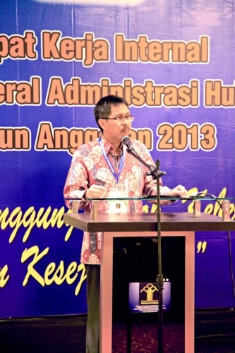 Surabaya - Dalam rangka upaya untuk mengoptimalisasikan kinerja di lingkungan Direktorat Jenderal Administrasi Hukum Umum (Ditjen AHU) menggelar kegiatan "Rapat Kerja Internal" yang diselenggarakan di Hotel Java Paragon Hotel & Residence di Surabaya 6-8 Desember 2013. Selain dihadiri oleh Pejabat Unit Eselon I dan II, kegiatan ini juga dihadiri oleh Seluruh Pejabat Struktural Unit Eselon III dan IV dilingkungan Ditjen AHU dan dibuka oleh Inspektur Jenderal Kementerian Hukum dan Hak Asasi Manusia (Kemenkumham) Agus Sukiswo.