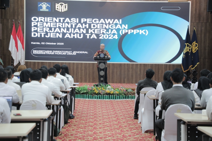 Jakarta - Sekretaris Direktorat Jenderal Administrasi Hukum Umum (Sesditjen) Hantor Situmorang meminta ASN Ditjen AHU untuk terus meningkatkan pengetahuan dalam rangka memberikan pelayanan terbaik bagi masyarakat, di ballroom Ditjen AHU, Jl HR Rasuna Said, Kuningan, Jakarta, Kamis (2/10/25)