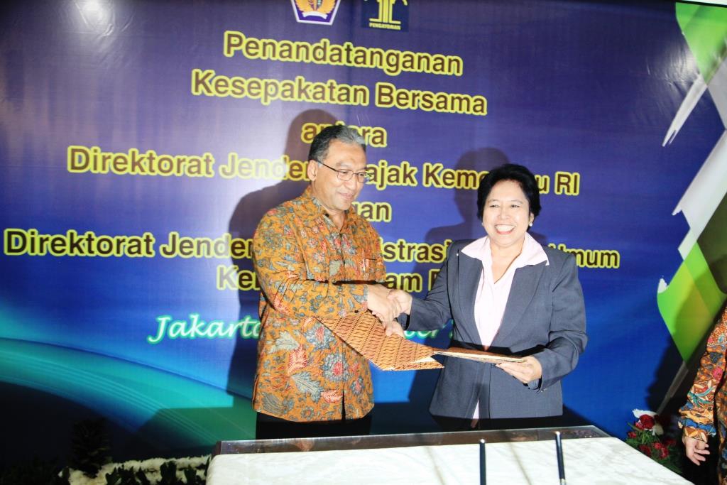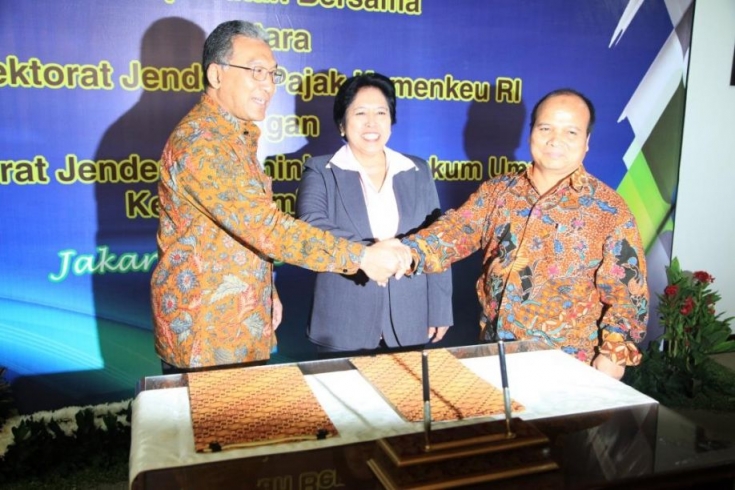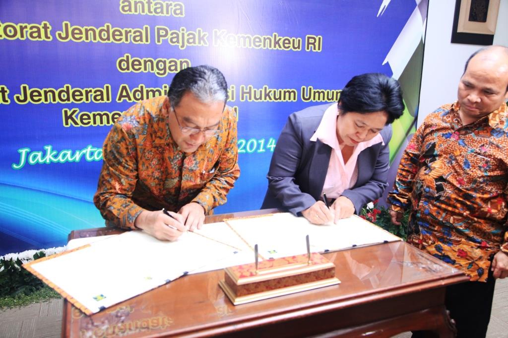 Ditjen Administrasi Hukum Umum (AHU) Kementerian Hukum dan Hak Azasi Manusia (Kemenkumham) menjalin kerjasama dengan Ditjen Pajak, Kementerian Keuangan (Kemenkeu) . Kerjasama itu tertuang dalam nota kesepahaman (MoU) yang ditandatangani pada 14 Oktober lalu di Jakarta. MoU diteken oleh Dirjen AHU, Harkristuti Harkrisnowo dan Ditjen Pajak, Fuad Rahmany, disaksikan oleh Staf Ahli Unit Kerja Presiden Bidang Pengawasan dan Pengendalian Pembangunan (UKP4), Yunus Husein. Kerjasama dua instansi ini diharapkan akan menjadi sinergi yang efektif untuk meningkatkan penerimaan pajak melalui efisiensi pengurusan Nomor Pokok Wajib Pajak (NPWP). Dengan perjanjian ini, Ditjen AHU Kemenkumham akan membantu mempermudah pemeriksaan NPWP, yang berdasarkan Undang-Undang Nomor 40 Tahun 2007, merupakan salah satu persyaratan pendirian perseroan terbatas (PT). Staf Ahli UKP4, Yunus Husein, menyambut baik kerjasama ini. "Kerjasama ini adalah bagian dari upaya penegakan hukum, melalui jalinan komunikasi yang saling percaya," kata Yunus. Ditjen Pajak, Kemenkeu, Fuad Rahmany, mengungkapkan dengan kerja sama ini, dalam waktu dekat akan dilakukan integrasi data daftar perusahaan yang ada di Kemenkumhan dan di Ditjen Pajak. Dengan kerjasama ini kata Fuad pihaknya memiliki tambahan data yang lengkap dalam upaya peningkatan kepatuhan wajib pajak badan usaha di masa depan. "Kami akan dapat data penting orang-orang kaya yang transaksi ekonominya besar, tidak bisa menghindar," ujarnya.